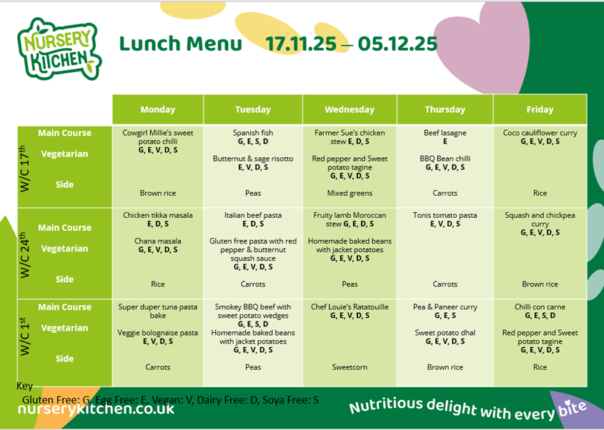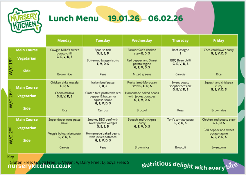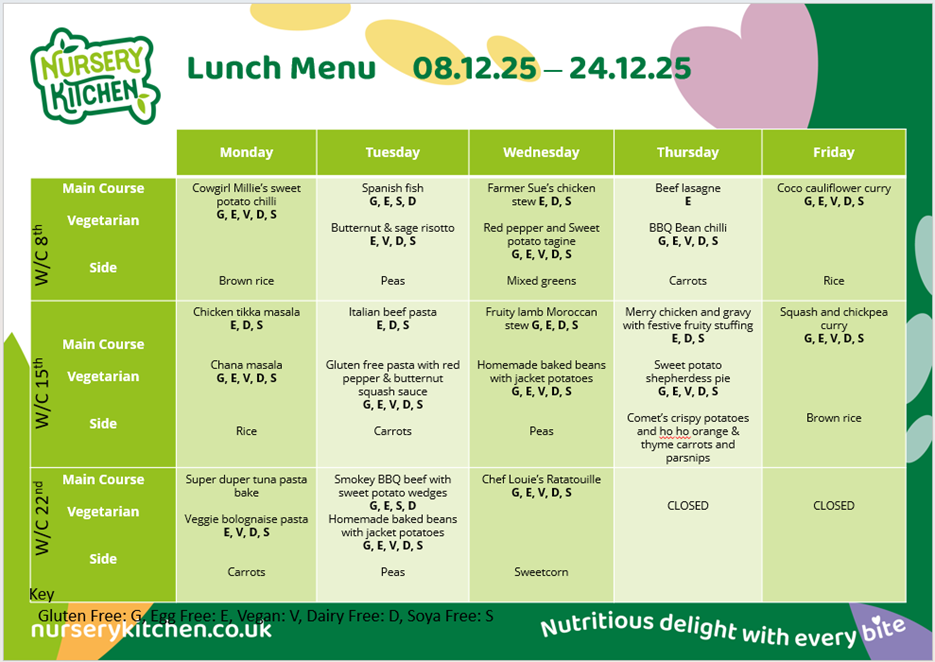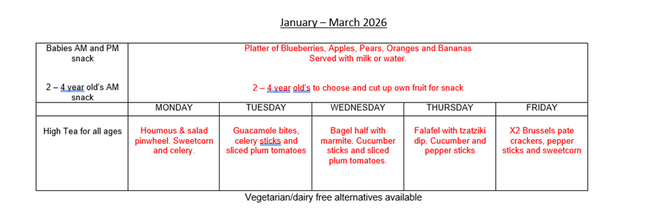 Every day, we offer a morning snack which is a variety of fresh fruit that we encourage the children to prepare themselves. Milk is offered at snack times and water is provided continuously throughout the day. We use an outside caterer, Nursery Kitchen, to provide a hot cooked lunch each day ensuring all our meals are well balanced and nutritional. In addition, we offer an afternoon snack (babies only) and high tea. We can also cater for most allergies or intolerances so just let us know if you have any special dietary requirements. To see our menus, please download a copy here: